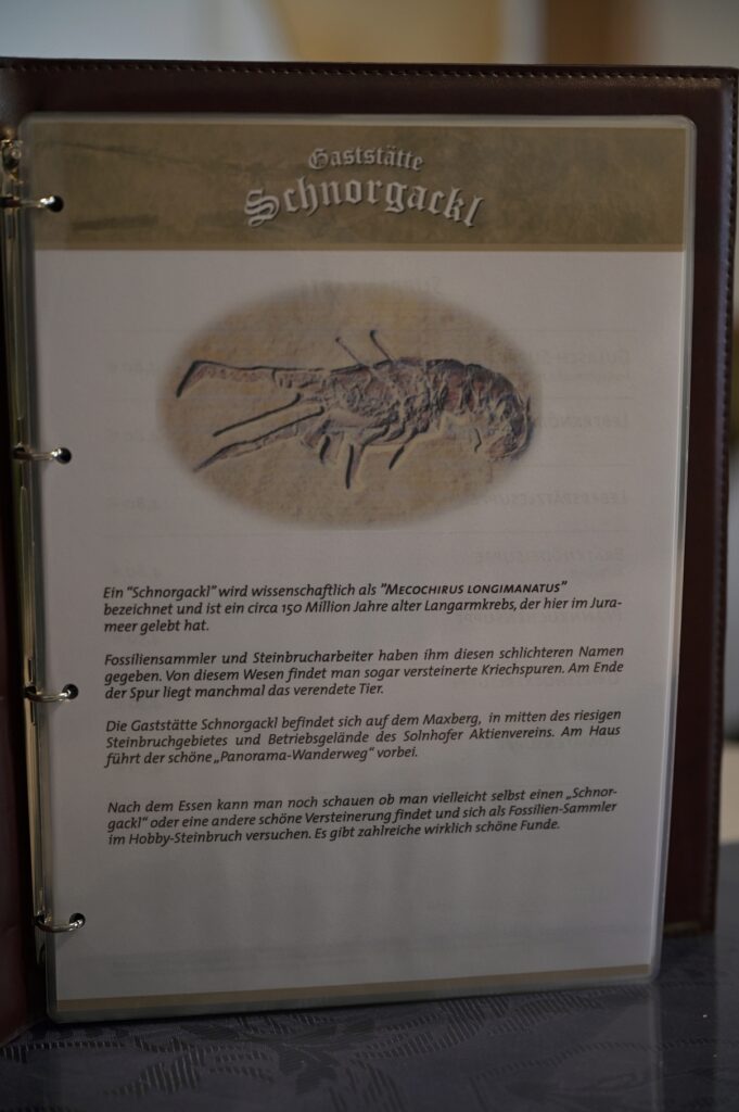 Der Mecochirus longimanatus ist ein fossiler Langarmkrebs aus der Zeit des Oberjura. Dessen 150 Millionen Jahre alten Versteinerungen finden sich im Solnhofener Plattenkalk. Eine Besonderheit dieses Fossils ist, dass es zusammen mit seiner von ihm verursachten Fährte (Fluchtspur) gefunden werden kann. Diese erscheint oft unregelmäßig. Der örtliche Volksmund machte daraus den … Schnorgackl. Fabelhaft!