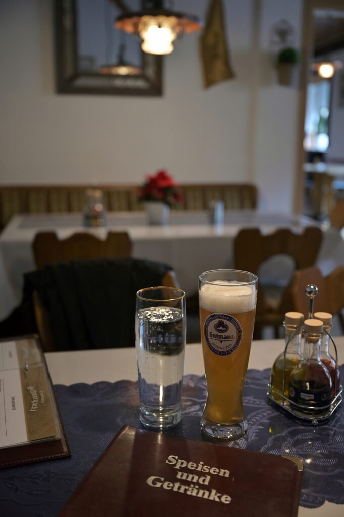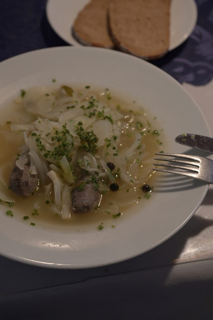 Die Speisekarte ist sehr üppig … Es gibt Suppen, Salate, Wild-, Fisch- und viele Fleischgerichte. Eine Kinderkarte und eine Eiskarte. Die Getränkekarte listet unter anderem elf(!) verschiedene Maß Bier auf. In einer solchen Konstellation habe ich gelernt, (m)eine Lösung in der Brotzeitkarte zu suchen. Die gibt es nämlich auch. Strammer Max, Bratwürste, Wurstsalat, Bratensülze (auch mit Bratkartoffeln), Leberkäse mit Ei, Presssack und verschieden belegte Brote signalisierten mir, dass hier die Vesper Wertschätzung genießt. Ich bestellte – Saure Zipfel. Und die waren köstlich! Die Bratwürste dafür (es gibt sie auch im Wettelsheimer Keller) kommen von der Treuchtlinger Metzgerei Geißelmeier. Sie ziehen im feinsauren Zwiebelsud mit Wacholderbeeren, Lorbeerblättern und Schnittlauch. Dazu ein frisches Bauernbrot.