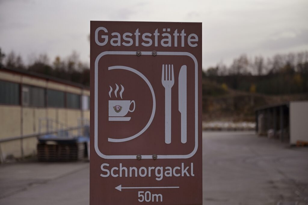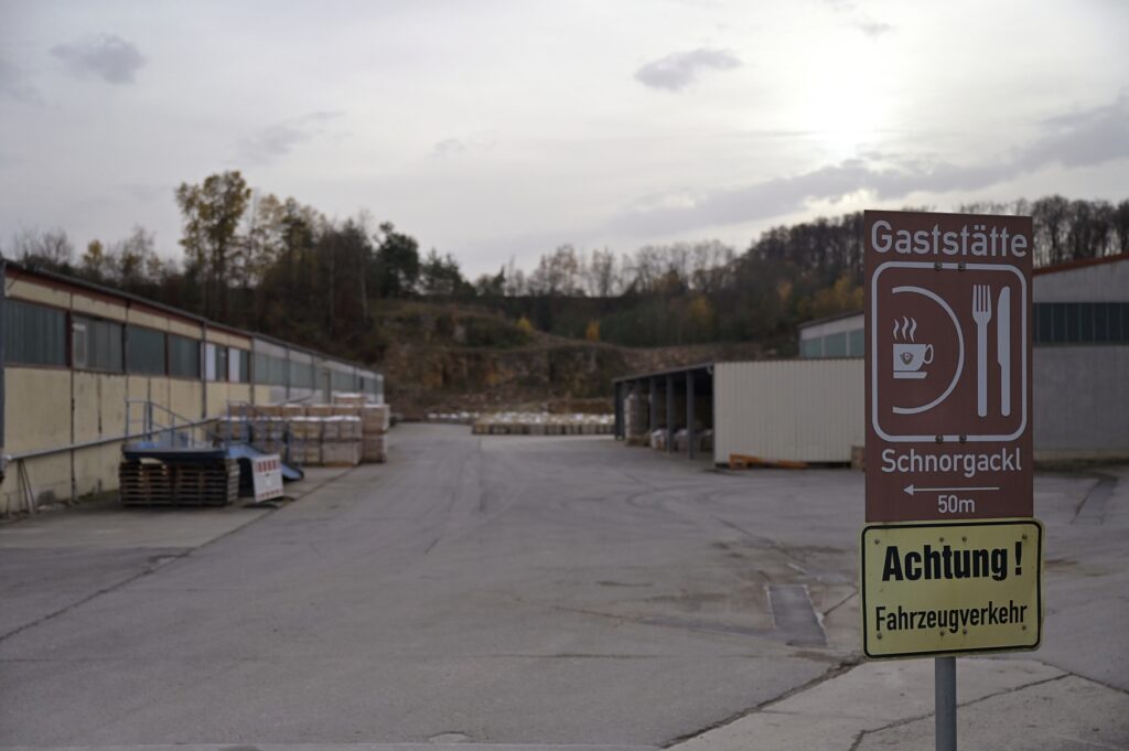 Vor einigen Jahren sah ich im Bayerischen Rundfunk in der vortrefflichen Reihe „Unter unserem Himmel“ die schöne Folge „Der Solnhofer – Eine Welt in Stein“. Ich schlage vor ➜ ansehen. Darin spielt auch die Gaststätte Schnorgackl eine Rolle. Ich war fasziniert davon, dass es in der Einöde auf dem Maxberg, zwischen Steinbrüchen, auf einem Betriebsgelände dazu, die öffentliche Möglichkeit zur Restauration gibt. „Öffentliche Wirtschaft“ ist dann auch auf einer Tafel nachdrücklich angezeigt – es wird nicht wenige gegeben haben, die sich vor diesem Fingerzeig nicht hineintrauten. Und das wäre schade, liegt die Gaststätte doch direkt am Altmühltal Panoramaweg, zwischen Solnhofen und Mörnsheim, Mittelfranken und Oberbayern. Vergangenen Freitag war ich endlich einmal dort.