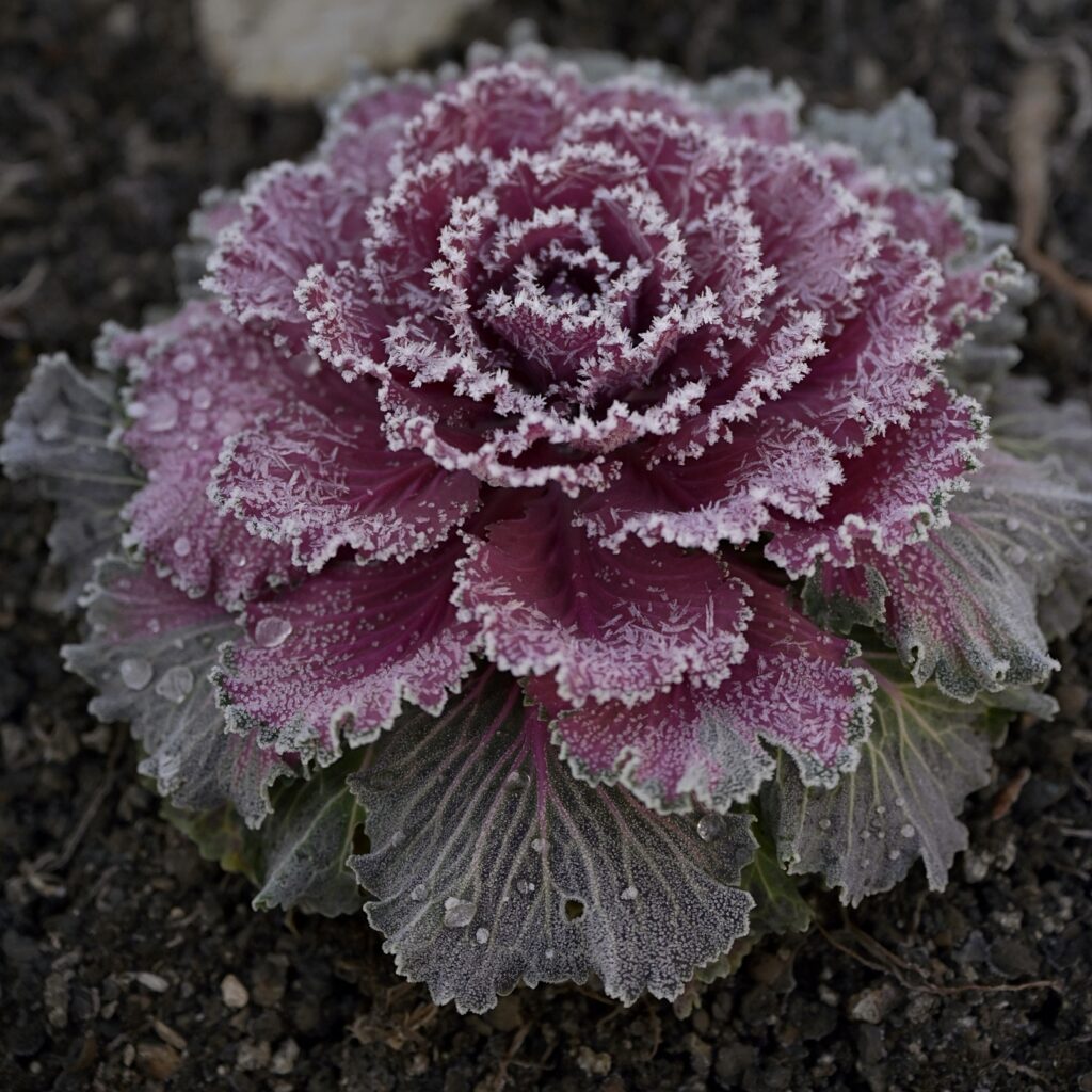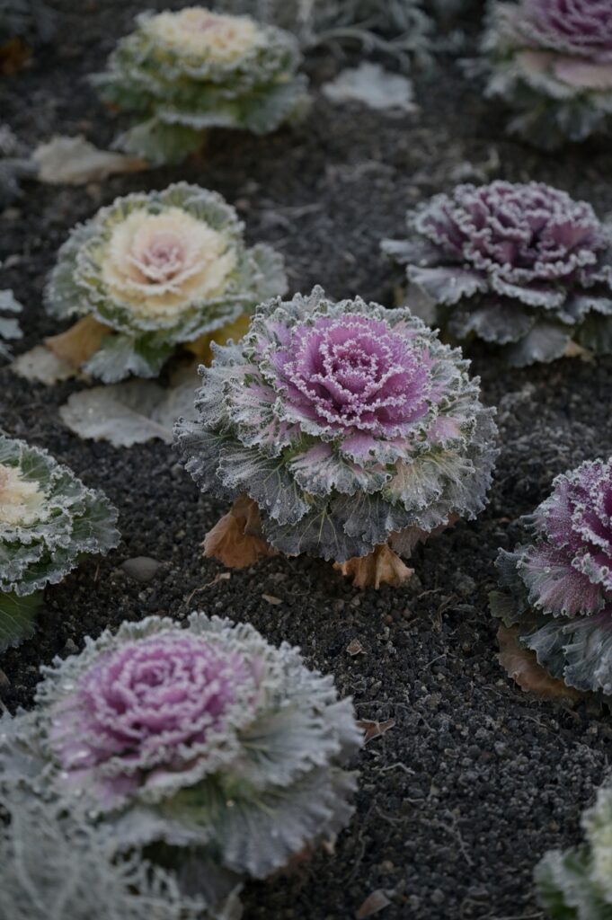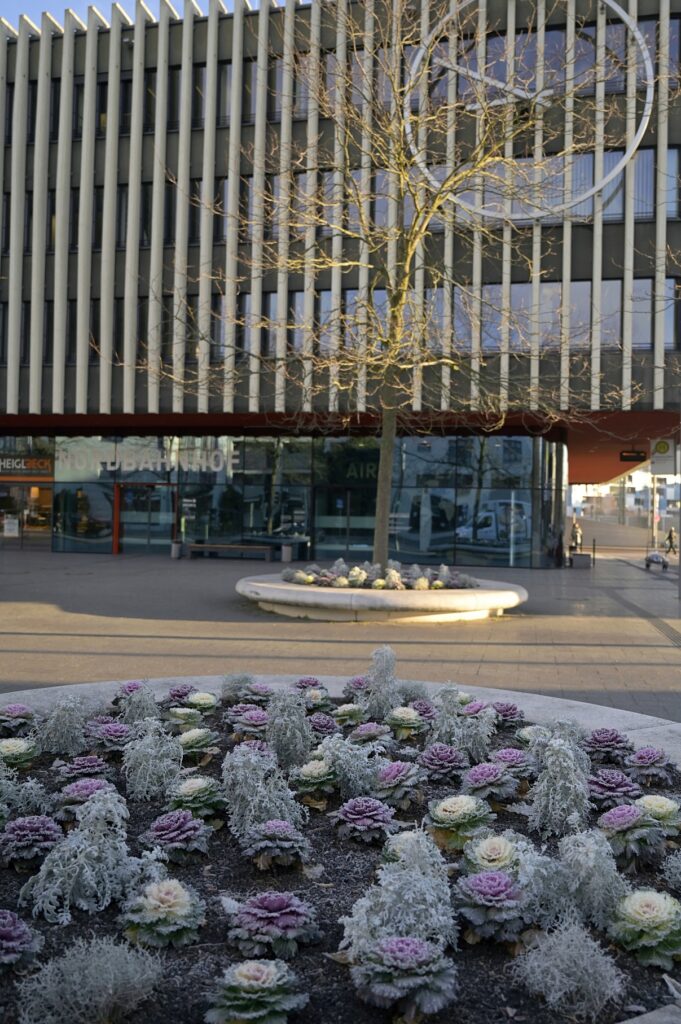 Die gegenwärtige Bepflanzung der großen Rundbeete vor dem Ingolstädter Nordbahnhof stimmt mich freudig. Und der Morgenfrost hebt die Szenerie dieser Tage noch einmal auf ein wahrhaftig ansprechendes Niveau. Am Ende kann man sich die Schönheiten auch noch schmecken lassen? „Essbare Stadt“ … ein Vorhaben für die Nutzung urbanen Raums zum Anbau von Lebensmitteln? Jein. Es sind vornehmlich Zierpflanzen – konkret: Roter und Weißer Zierkohl. Die meisten Züchtungen stammen aus Japan. Und wir wissen, die verstehen was von Gartenkunst! Etwas nachlesen zeigt – sie sind genießbar. Im Rahmen der klassischen fünf Sinne, belasse ich es aber hier – ausnahmsweise – beim Sehen. Sehenswürdig.