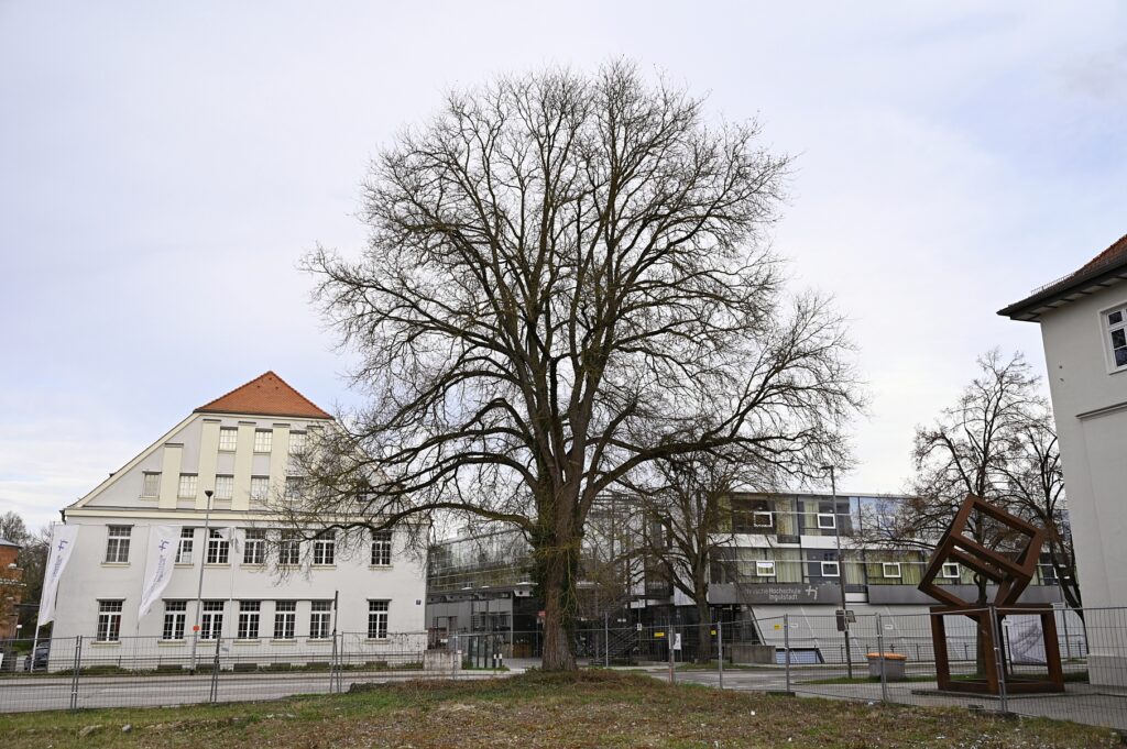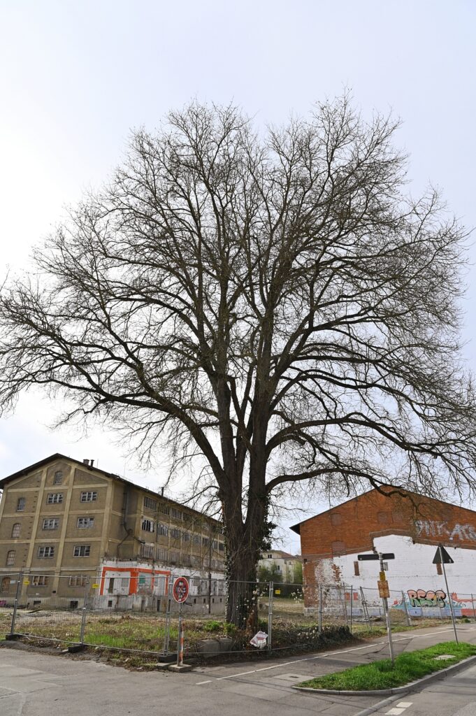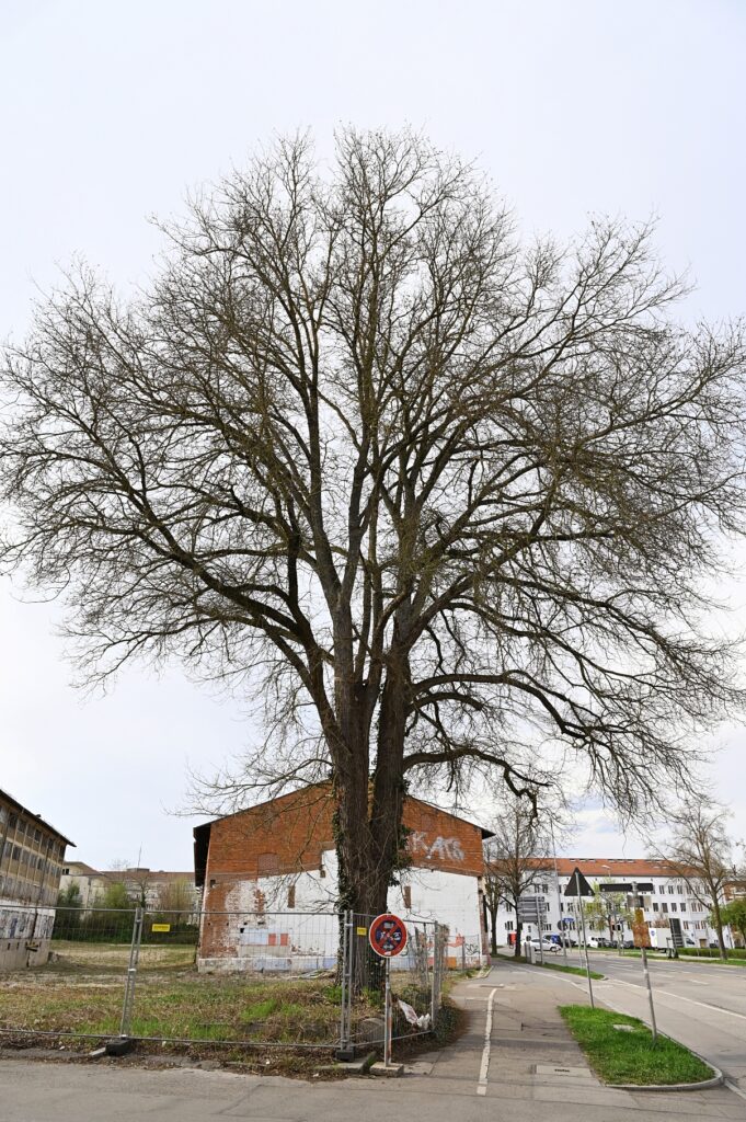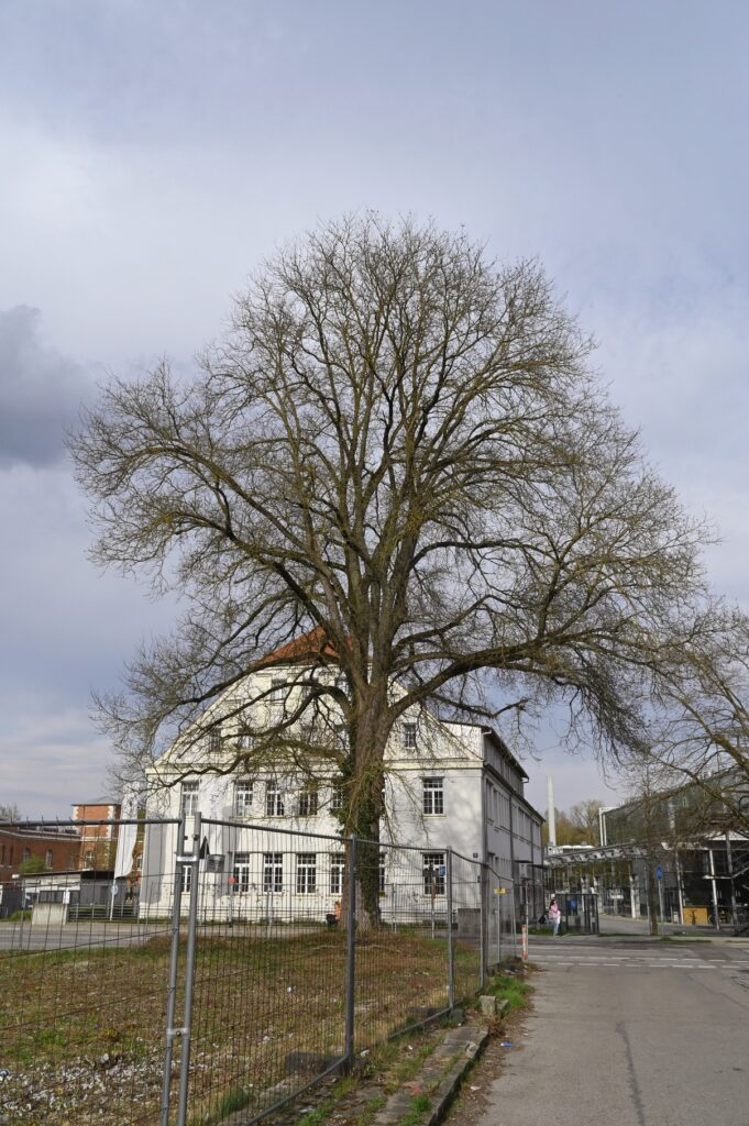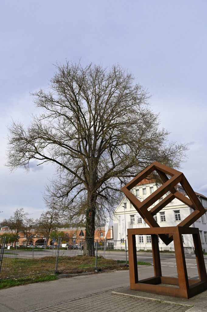 Gegenüber der Technischen Hochschule Ingolstadt, zwischen Lechner Museum (die zwei Eisenwürfel deuten es an) und Körnermagazin, steht eine imposante Feld-Ulme. Genau hier: schale.handtuch.schlaf. Am 05. April 2025 habe ich sie (der man die Nummer 39 gegeben hat) für diese Notiz eingefangen. In der Liste der Ingolstädter Naturdenkmäler gibt es nur diese zwei weiteren Exemplare der Art.