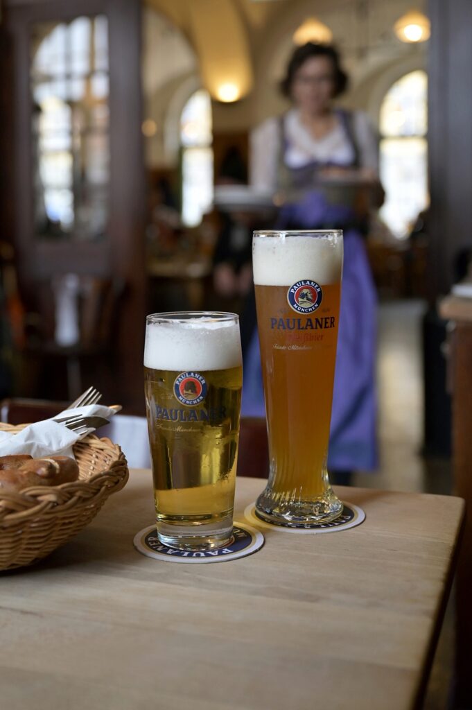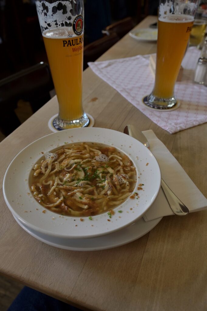 ➜ 31.10.25. Ein Freitag. Erstmals lasse ich mich in der „Brauereistubn“ nieder. Am Tisch 16 – kein schlechter Platz. Ich dachte bis dahin, die Reviere der Bedienungen zu kennen. Nix da – unerwartet aber unumstößlich steht meine liebste Kraft vor mir – hach! Lassen wir also deren Wege unergründlich. Heute mit dabei ist mein Freund Torsten aus Mittelfranken. Braucht du ein Buch? Kauf es nicht bei Jeff – kauf es bei ihm! Wir ließen uns munden: Pfannkuchen- und Nudelsuppe mit Ochsenfleisch – sich einstellende Wiederholungen mögen manchen beim Lesen ermüden. Ich jedenfalls würde für diese Suppen zu Fuß nach München gehen. Den feinen Rahmspinat mit Spiegeleiern und Salzkartoffeln musste ich jetzt selbst einmal bestellen. Mein Gegenüber gönnte sich noch einen kleinen Schweinsbraten. Die Weißen haben sich der Kamera entzogen.
