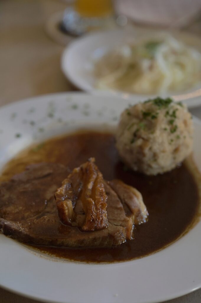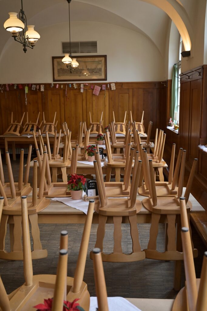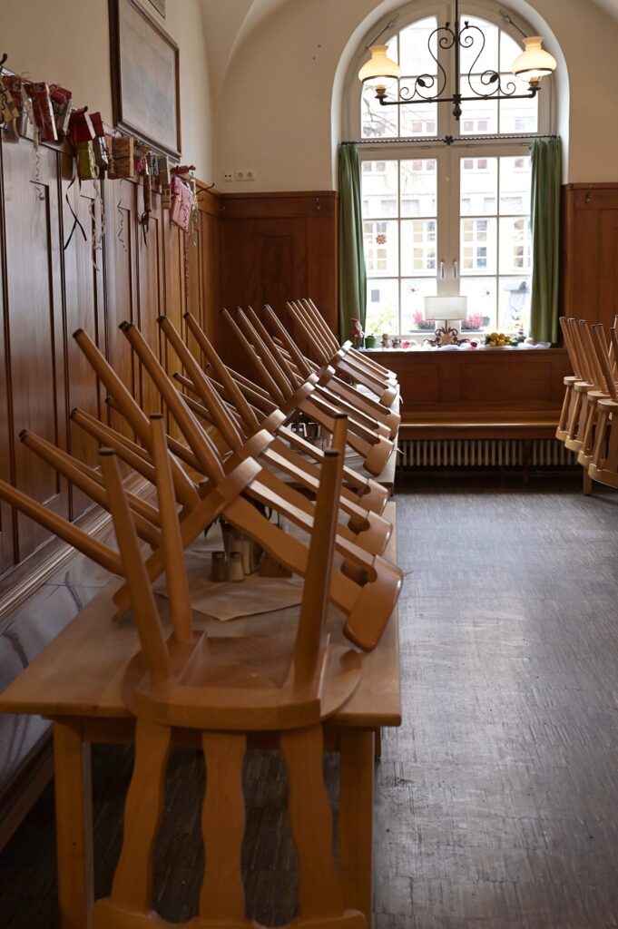 ➜ 29.11.25. Da ist man ein alter Hase und hat doch tatsächlich die Schließzeit für Samstag nicht sauber auf der Rechnung! Montag bis Freitag 7:00 bis 16:00 Uhr. Samstags 7:00 bis 13:00(!) Uhr. Wir haben einen Zug ausfallen lassen und waren kurz davor leichtfertig noch einen späteren zu nehmen … Erst gegen halb eins betraten wir (Petra und ich) das Wirtshaus. Mit „So spät?!“ wurden wir empfangen. Und einem Lächeln. Alles ging gut – wieder in der „Brauereistubn“. An Tisch 20 – ein hervorragender Platz. Wer alle bisherigen Notizen gelesen hat, erfreut sich hoffentlich daran, wie immer neu man seine Lieblingsgerichte in Szene setzen kann. Beim Rausgehen – zu später Stunde – standen die Stühle schon Kopf.