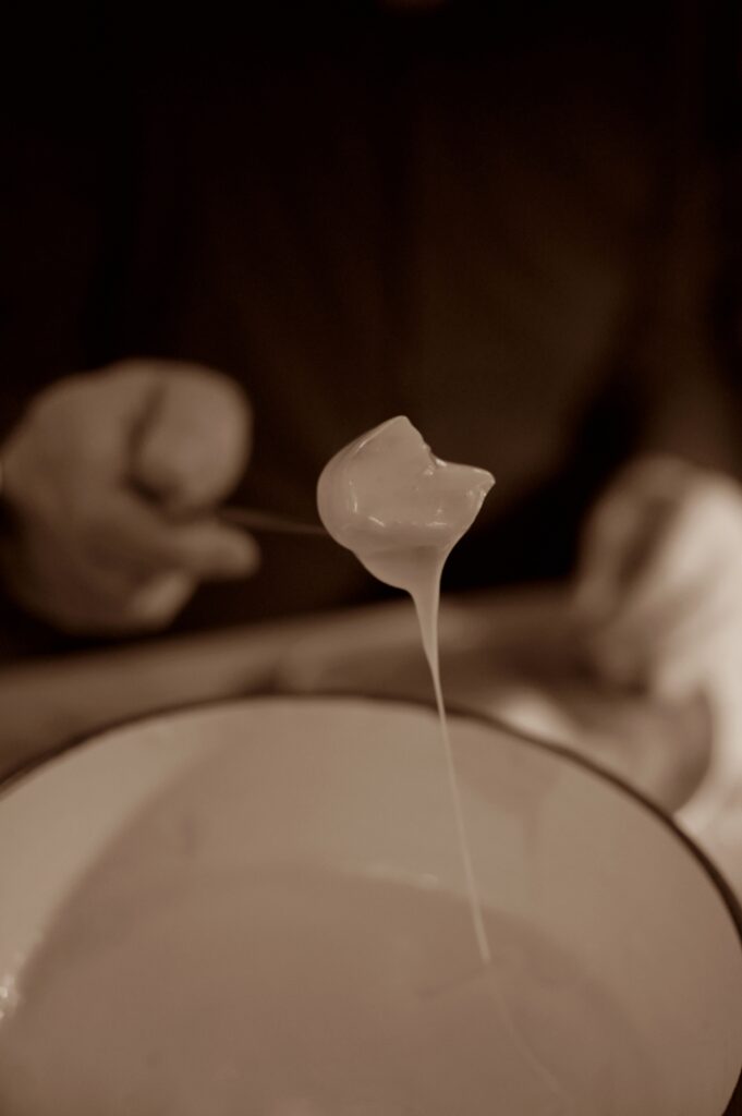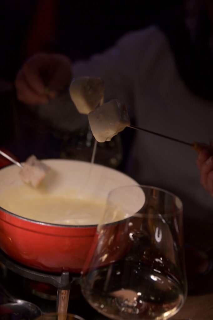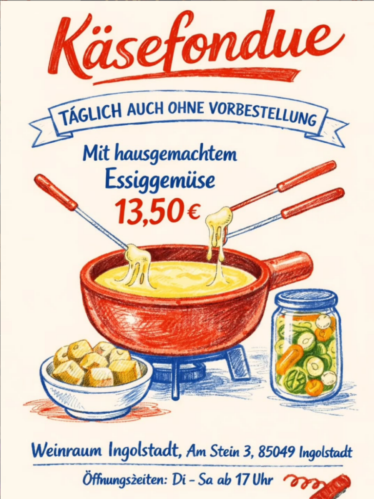 Helga und Markus Munz haben in ihrem großartigen Weinraum (aufgemerkt! – frisch umgezogen) gottlob andere Regeln für den Verlust eines Brotstücks im Käsefondue. Am besten Ruhe bewahren – und die Essensbegleiter ins Spiel bringen. Die Weinkarte bietet dafür ausgezeichnete Möglichkeiten. Ich habe sogar den Erich Machherndl darin entdeckt. Wer so auswählt und listet, der weiß was er tut!