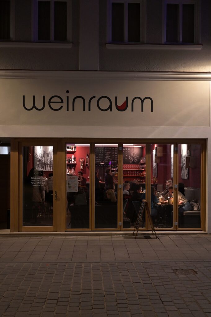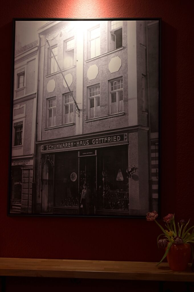 Im Weinraum hängt ein Foto aus vergangener Zeit. Die Räumlichkeiten beherbergten seinerzeit ein Schuhgeschäft. Das Schuhwaren-Haus Gottfried von Ludwig Gottfried. Im Schaufenster links daneben ist zu lesen: Faltermaier – Kakao. Tee. Alle von mir gefütterten Suchmaschinen gingen beim Wunsch auf Informationen dazu vollständig in die Knie. Vielleicht kann die Familie Munz etwas Erhellendes in die Kommentare schreiben?