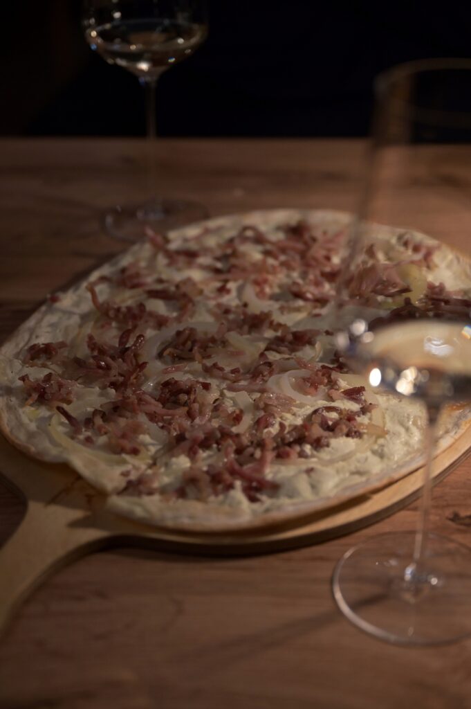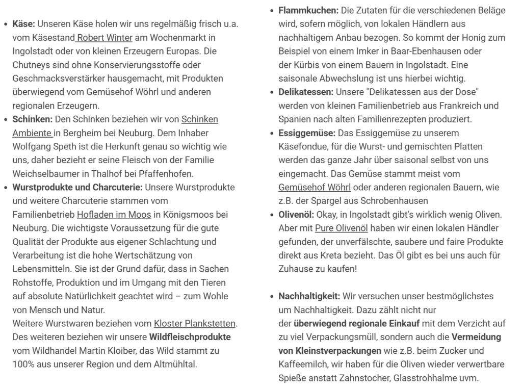 Meine Notiz beinhaltet eine Tücke. Das köstliche Käsefondue dürfe jetzt nicht mehr bestellbar sein. Erst im Spätherbst wieder. Das macht aber nichts. Weil man sich den Weinbegleitern und Speisen im Weinraum nämlich so lobenswert annimmt: „Wir legen großen Wert auf Regionalität, Qualität, Nachhaltigkeit und Transparenz. Hier findest du eine Liste unserer Partner“: